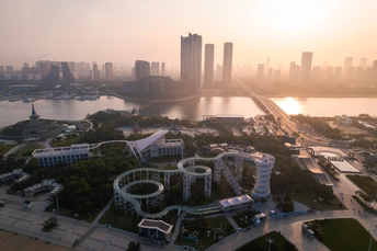 初夏的日照,落日的余晖洒满海曲东路大道上,城市的天际线矗立着多栋高楼大厦,在柔和的阳光下,轮廓清晰又带着朦胧美感,宽阔的水域宛如镜面,反射着阳光,唯美而又静谧。