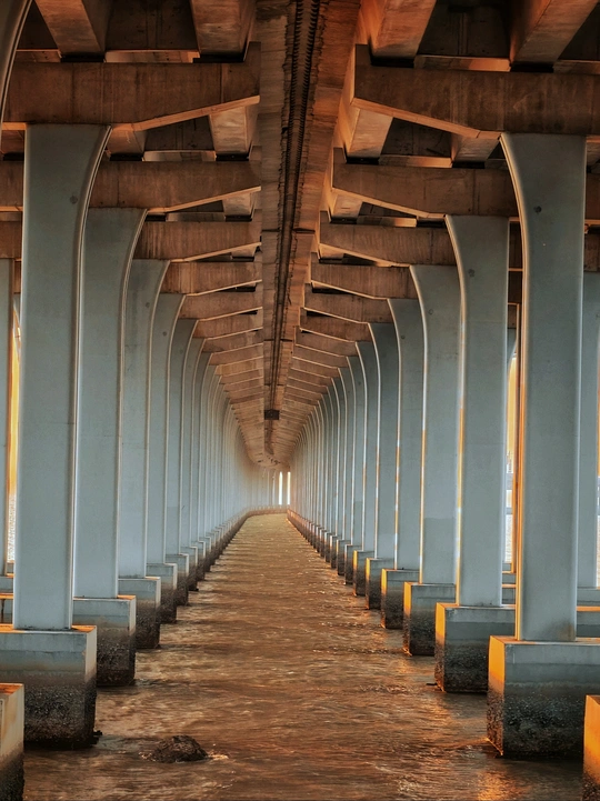 在这桥底的世界,钢筋水泥构筑起秩序的长廊。粗壮的桥墩如沉默的卫士,撑起上方的繁华,自己却扎根于岁月的洪流。阳光斜斜洒下,给冰冷的混凝土披上一层暖裳,光影交错间,似是时光的笔触在描绘往昔与未来。脚下的水波荡漾,每一道涟漪都像是生活的褶皱,藏着不为人知的故事。这里是喧嚣之外的静谧角落,是繁华背后的质朴坚守,在桥底之下,时光悠悠,流淌着无声的力量。