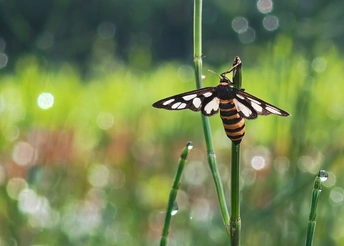 清晨,露珠在草尖闪烁。一只鹿蛾停歇于此,黑与白交织的翅翼,橙黄与黑相间的腹部,在晨光里熠熠生辉。它似是大自然遗落的精美书签,夹在绿意盎然的篇章间,静静诉说着关于田园的诗,于静谧中藏着灵动,于平凡处蕴着绮丽。