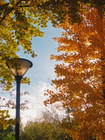 画面中,金黄的银杏叶在枝头肆意舒展,与澄澈蓝天相映成趣。路灯静静伫立,似是这场秋日盛宴的忠实守望者。阳光透过枝叶洒落,交织出秋的诗意与静谧,每一抹金黄都诉说着季节的故事 ,尽显秋之韵味与美好。