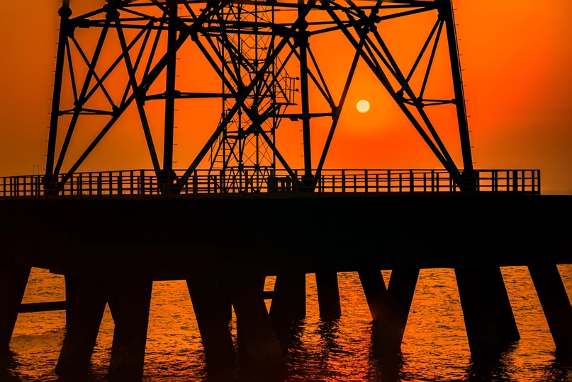 深圳西湾红树林公园拍海上日落,太阳落进了海上电力铁塔,剪影中的铁塔与太阳合体了。