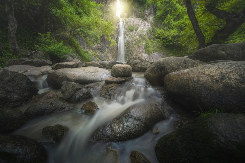 之前去到九华山脚下的峡谷里,寻找瀑布,走了大概一个多小时,听到水声,于是加快脚步,果不其然,有一处小瀑布,就赶紧寻找机位,看到瀑布下面有许多大块和小块的岩石,脑海中就迅速浮现之前看过的作品,就想着以岩石及其缝隙中的水流为前景,瀑布为主题拍摄,此次加了一块nd64滤镜,将光圈开到f11以达到丝滑水流的效果和较好的画质。