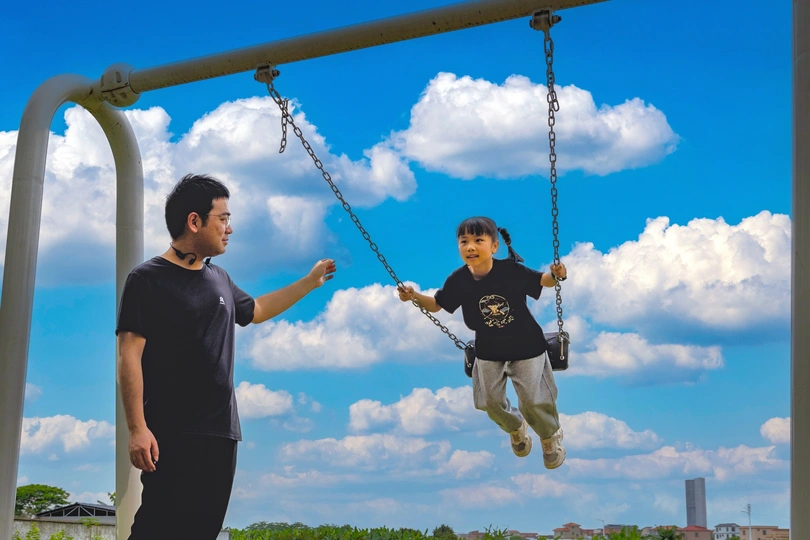 - 阳光倾洒,云朵飘荡,你在秋千上拥抱蓝天。我守望着你的快乐,这一刻,时光都变得柔软。