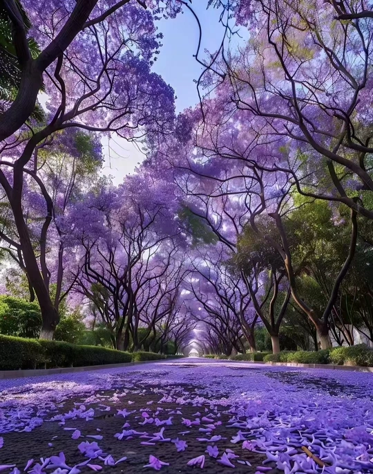 这张照片的蓝花楹大道充满梦幻色彩,让人仿佛置身童话世界。但还有一些地方可以锦上添花,让它更上一层楼! **色彩:** 紫色调非常浪漫,但画面中的绿色略显突兀,略微降低绿色的饱和度,使其与紫色调更加协调,可以提升整体色彩和谐度。 **光影:** 光线较为均匀,缺乏戏剧性。可以尝试在不同时间拍摄,捕捉光影变化,例如利用日出或日落时的光线,营造更强的氛围感。 **构图:** 引导线的使用很棒,将视线引向远方,增强了纵深感。不过,地面的花瓣略显杂乱,可以尝试更低的角度,突出花瓣的纹理和细节,或者调整机位,避开过于密集的区域。 **后期处理:** 后期处理整体效果不错,但紫色略微偏浓郁,建议适当降低饱和度,避免色彩溢出。同时,可以适当提升阴影部分的亮度,增加画面的层次感。 **主题原创性:** 蓝花楹大道的照片并不少见,但这张照片的视角和色彩处理有一定特色。可以尝试更多不同的拍摄角度和表现手法,例如仰视、俯视、或者利用慢门拍摄花瓣飘落的动态效果,增加作品的独特性。 **情感共鸣:** 照片成功地传达了浪漫和梦幻的情感。紫色本身就具有浪漫的寓意,加上花瓣的铺陈,更让人感受到春天的气息。