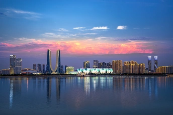 杭州钱塘江畔的城市地标:杭州之门、奥体中心