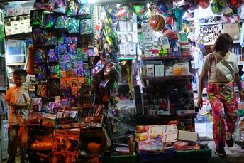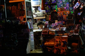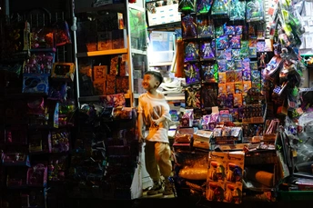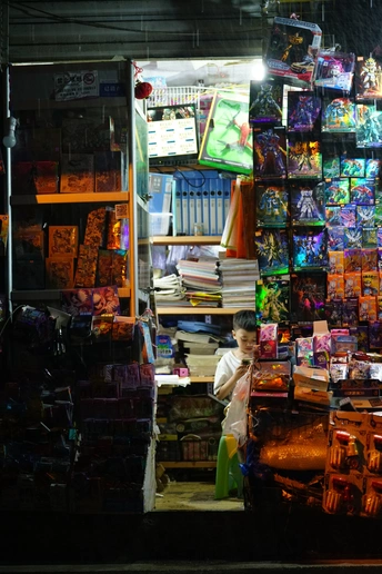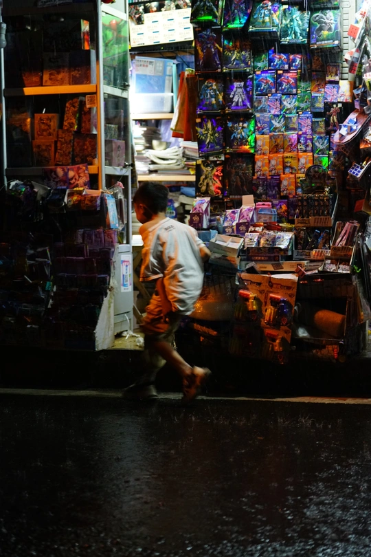在小店对面躲雨的时候,看见一个孩子正在学习。他听见外面下雨了,就不再做作业。出来看雨,玩雨,被母亲责骂。