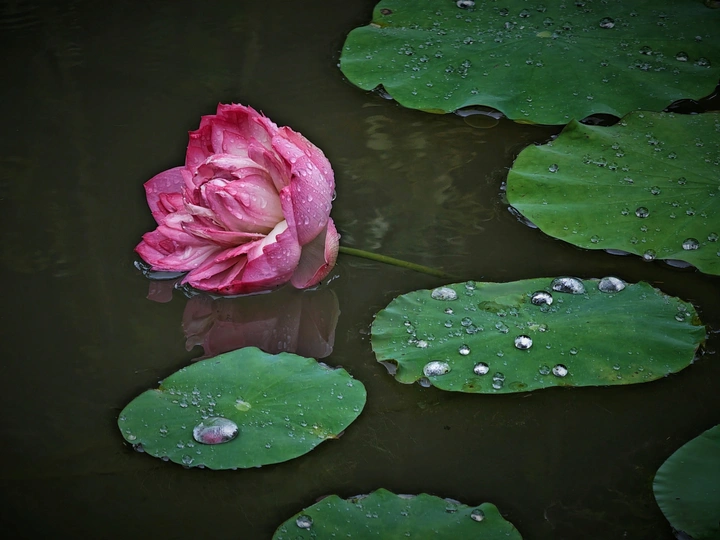 一朵盛开在水面上的荷花,荷花呈现出粉红色,花瓣层层叠叠,显得非常娇艳欲滴。荷花周围有几片绿色的荷叶,荷叶上布满了晶莹剔透的水珠,在光线下闪闪发光。水面平静,反射出荷花和荷叶的部分影像,整体氛围宁静而美丽,给人一种清新自然的感觉。背景中的水面颜色较深,进一步突显了荷花与荷叶的鲜艳色彩。