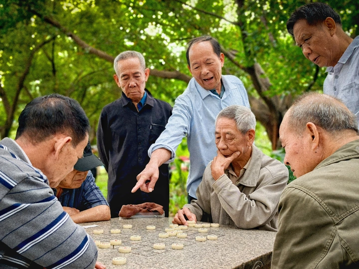 - 林间一隅,石桌为台,象棋为媒。老人们齐聚于此,或沉思,或指点,在这一方棋盘上,续写着往昔情谊,也勾勒出生活最闲适的模样。