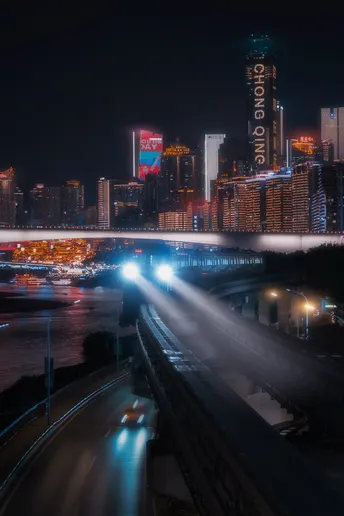 夜幕笼罩下,重庆展现出独有的魅力。灯火璀璨的高楼大厦勾勒出城市天际线,“CHONGQING”字样醒目耀眼。桥上列车灯光穿透夜色,与公路上的车流交相辉映,江面波光粼粼,共同绘就山城绚丽多姿的夜景画卷。