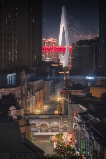 夜幕降临,重庆白象街古意与现代交融。古朴建筑在灯光下韵味悠长,“白象街”标识醒目。远处千厮门大桥璀璨夺目,白色桥塔与红色桥身交相辉映,共同勾勒出山城独特的夜景轮廓,尽显城市的迷人风姿。