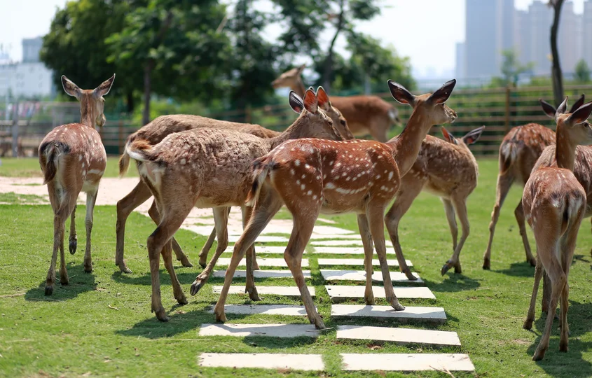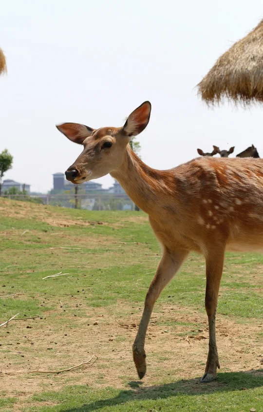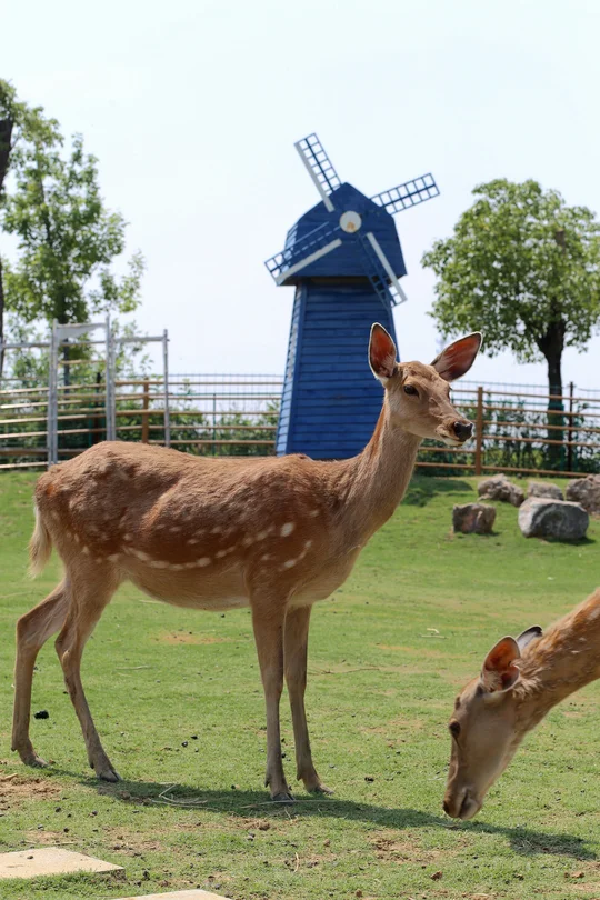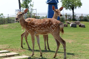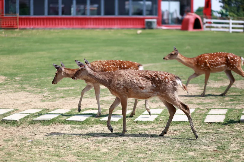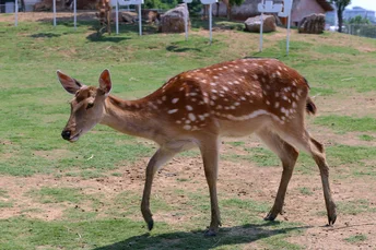 梅花鹿(学名:Cervus nippon)属于鹿科鹿属 [1],体长140-170厘米,肩高85-100厘米,尾长12-13厘米,体重100-150千克 [13],雄性具有角,雌性则无角,雄鹿的角通常分为3-4叉。梅花鹿耳大而直立,四肢纤细,躯干匀称,尾巴较短。皮毛呈红色,沿脊背两侧有多行不规则的白色斑点,下颌为白色,鼻面和颊部为沙黄色,尾巴的背面为深棕色,尾巴的下方和鼠蹊部为白色,腹部毛发为淡棕色。夏季的毛发较薄且无绒毛,冬季毛发变得浓密,呈现出核桃褐色,白色斑点则相对不太明显。梅花鹿广泛分布于中国东部,延伸至西伯利亚东部、日本、琉球群岛、朝鲜半岛,并曾分布于越南北部,还被引进到欧洲、美国和新西兰 [5]。其主要栖息地包括混交林、山地草原和森林边缘 [6]。其食性极为广泛,食用的植物种类多达145种。在冬季和早春,主要食用各种枯草以及林木灌丛的幼枝嫩芽,夏季则以青草、树叶和灌木的嫩枝幼芽为食,秋季则以草本植物及灌丛中的多淀粉果实为主。梅花鹿喜群居,冬季的群体常达到20-30只以上。其交配期在9-10月,妊娠期7-8个月,翌年4-5月产仔,每胎通常产1仔,偶尔产2仔 [7]。成体的寿命