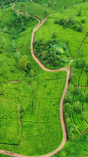 小路蜿蜒曲折伸向远方, 茶田绿意盎然铺全山顶