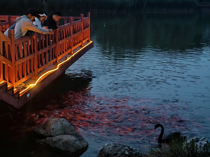 校园北湖养了一群锦鲤,没事的时候,大家都喜欢喂喂鱼,沾沾好运。夕阳西下,华灯初上,湖面倒映着天色,泛起一层淡淡的青蓝。湖边的栈桥上,一群学生正撒着鱼食,湖里的锦鲤挤在一起争抢着食物。一只黑天鹅远远的游过来,似乎也想分一杯羹,但好像挤不进去,只能优雅地在周围游弋着。