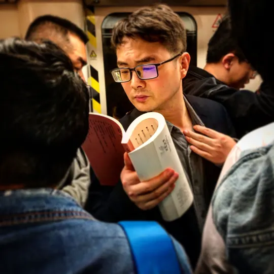 在如今的电子时代,看实体书的感觉越来越少了。在上班通勤的路上,在人挤人的地铁上,还能手捧实体书看得津津有味的人更是难得一见。于是我马上用手机记录下这一刻
