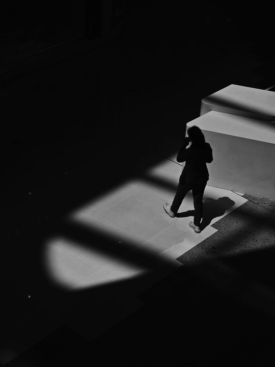 她一边讲着电话,一边匆忙前行。脚步声隐匿在话语间,外界的喧嚣被自动屏蔽。每一步,都似踏在自己的节奏里,电话那头传递的,或许是牵挂、是工作、是生活的琐碎。而她,在这明暗交替的世界中,显得有点孤单落寞......
