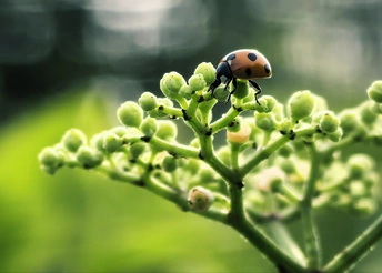 在绿意盎然的枝梢间,一只七星瓢虫悠然栖落。它橙红的鞘翅点缀着墨黑斑点,宛如大自然精心雕琢的宝石。