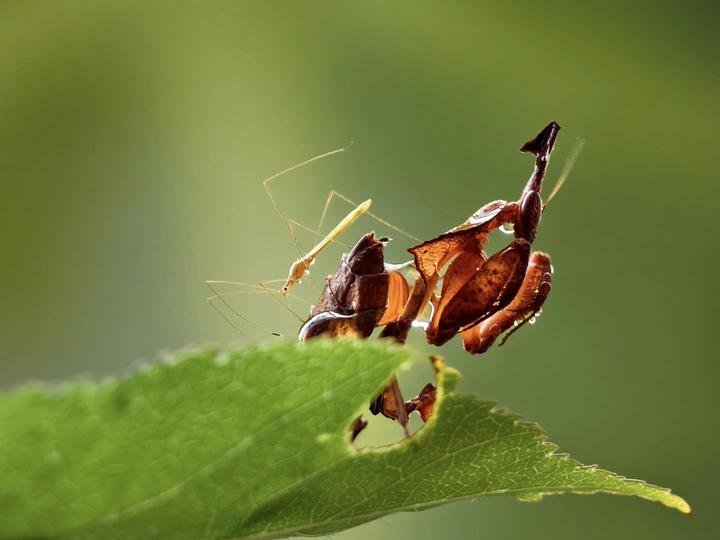 一只 幽灵螳螂刚饱餐完,正倚着草叶休憩。此时,一只不知死活的蚊子悄然爬上它的身体,贪婪地嗅着准备在哪下口——却未察觉螳螂镰刀般的前足已微微抬起…