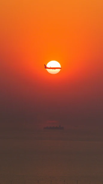 即将降落深圳宝安机场的飞机从西海岸的上空飞过,刚好从日落的中间穿过,下方是海上的货轮行驶在伶仃洋上。