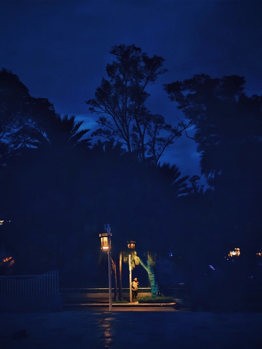 夜幕降临,宝石蓝天空也即将退幕,温黄色的灯光笼罩住黄衣男孩孤单的身影,仿佛这里是一个全世界最安全最温暖的地方,可是天黑了,为什么不回家呢?