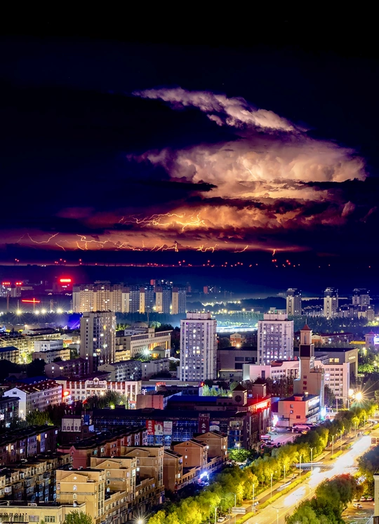 夜色如墨,霓虹是倔强的星火。 云端战鼓擂动,银蛇狂舞倾泻而下—— 摩天楼沉默伫立,见证光与暗的永恒鏖战。 这一刻,繁华如此渺小,又如此悲壮。 你心中,是否也有一场等待释放的暴风雨?💫