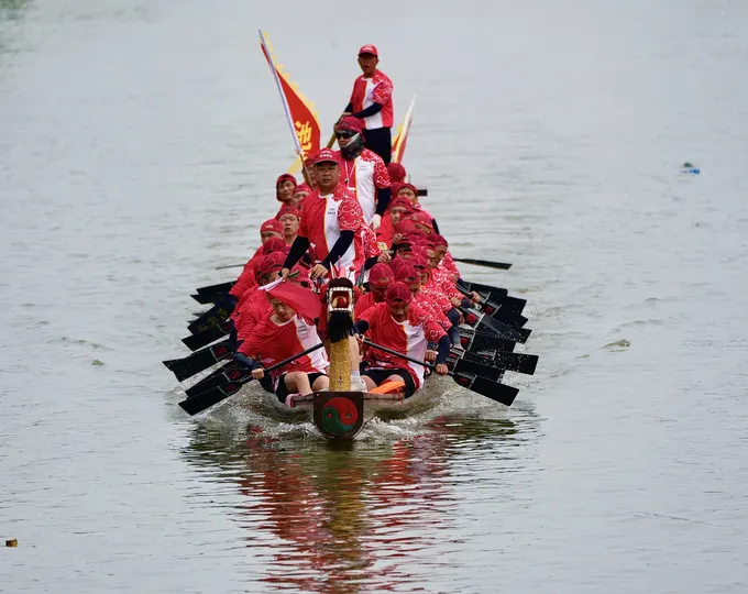 时近端午,一只龙舟如离弦之箭,划破平静水面,自水面远处而来,身着红衣的健儿们,齐心协力,挥桨奋进。那激昂的节奏,是拼搏的鼓点;那飞扬的水花,如热血的绽放。