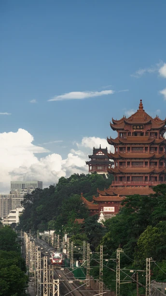 取景器里,黄鹤楼静静立在葱郁树丛间,下方铁轨向远方延伸,取景时采用三分法构图,让古建群、铁路动脉与都市天际线形成视觉纵深,青空为幕布,云絮作留白,记录下文明迭代中那个充满张力的瞬间。
