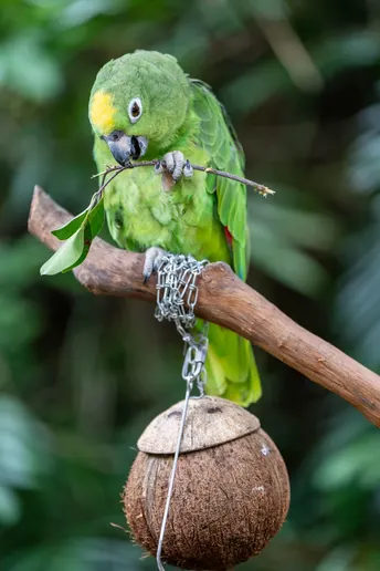 树枝上的鹦鹉,一只脚站立,一只脚叼着树枝,脚下吊着一颗椰子
