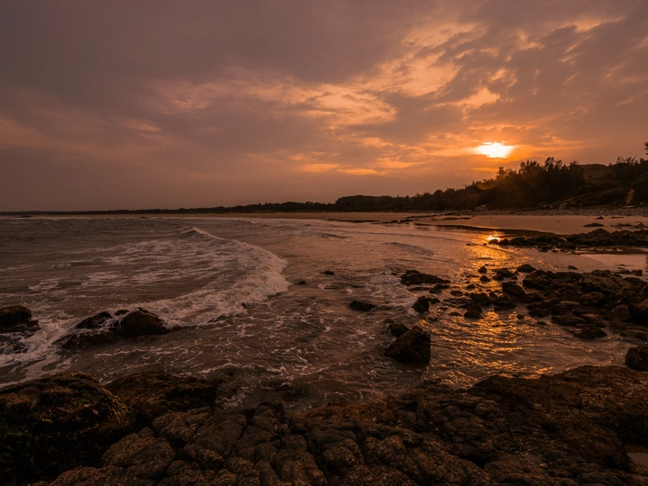 海边沙滩礁石上,落山的太阳终于在云层中显露头。
