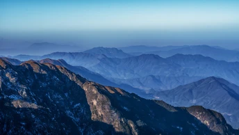 清晨的阳光扫过金顶,嶙峋山岩泛着冷冽的灰白色,是初雪化了。远处层叠的山脉褪成青灰色与淡蓝天空交界处晕染出柔光,像被雾气洇开的铅笔素描。俯拍视角下,冷调蓝灰色主视觉贯穿画面,阳光切割山体明暗的瞬间,荒芜感得到了张力。