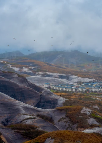 阴天滤镜下,起伏的灰黑色山体像被揉皱的旧报纸,零星黄褐色植被点缀出斑驳色块。十只黑鸟掠过天空划出细长弧线,山脚白墙蓝顶民居聚成几何色团。灰调画面里,飞鸟与房屋成为视觉锚点,给灰蒙蒙的画面撕开一道透气口。