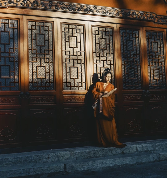 战国袍服饰的佳人,优雅地倚靠于古色古香的建筑之前。她身着一袭橙红色长袍,衣袂随风轻扬,宛如灵动的诗篇;头上佩戴着精致发饰,更添几分典雅气质。她手中轻握着书卷,神情温婉且专注,仿佛沉浸于书中的天地。背景中的木质门窗,雕刻工艺精湛,每一处纹路都流淌着浓厚的历史韵味与文化气息。暖色调的光线轻柔地洒落其上,勾勒出一幅宁静而庄重的画卷。这不仅是对传统文化的深情致敬,更是古典美的生动再现,宛如一扇时光之门,引领观者踏入那个悠远而诗意的世界。 相机:哈苏2000fcm + cf80 f2.8 胶卷5207 扫描仪:sp3000