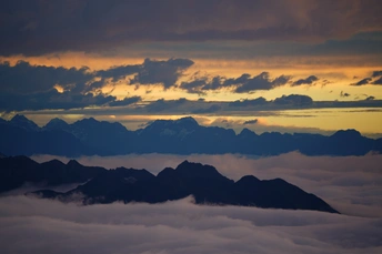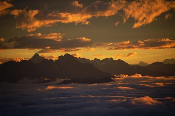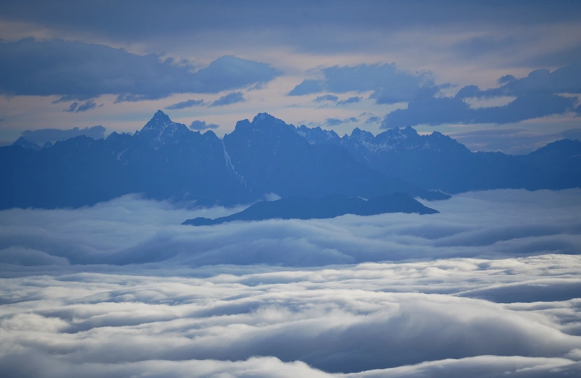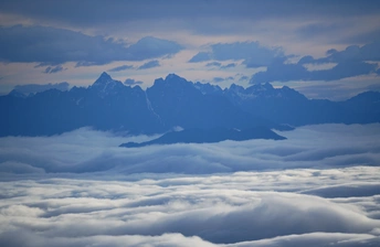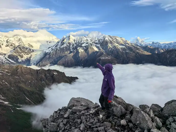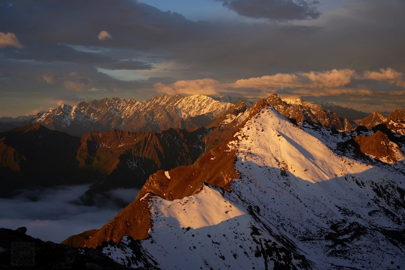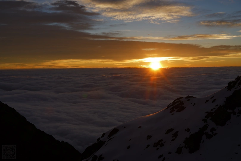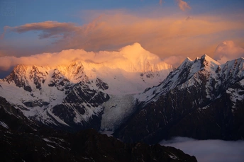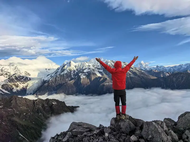 海螺沟二层山,直面蜀山之王贡嘎雪山,登顶海拔4650米望郎包山顶,看到了震撼的云海日出,日照金山
