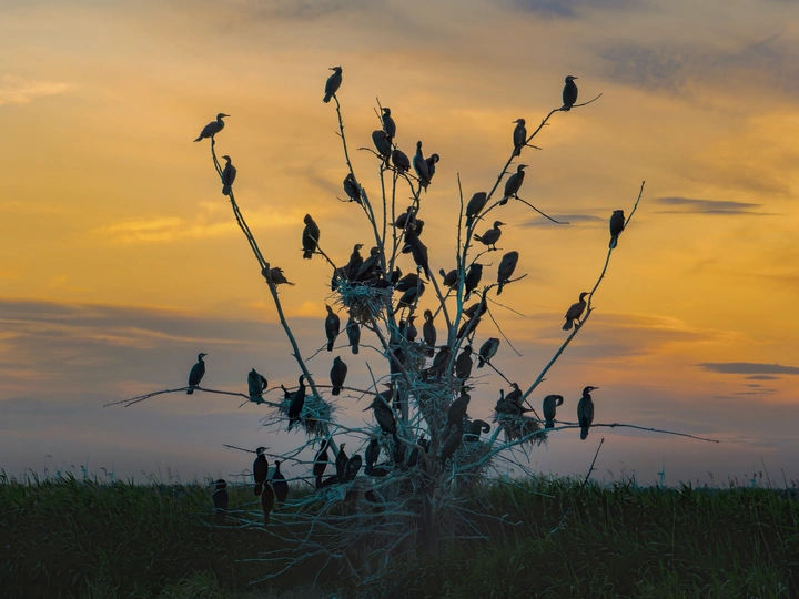暮色泼洒,染透天际,一棵枯树立于绿野,成了鸬鹚的琼阁。它们或独立枝桠,剪影如墨;或挤在巢中,共享静谧。夕阳为幕,风声作弦,在自然搭建的“琼阁”里,与余晖相融,把平凡的栖息,晕染成诗意的画,诉说着天地间生灵与黄昏的温柔故事 。