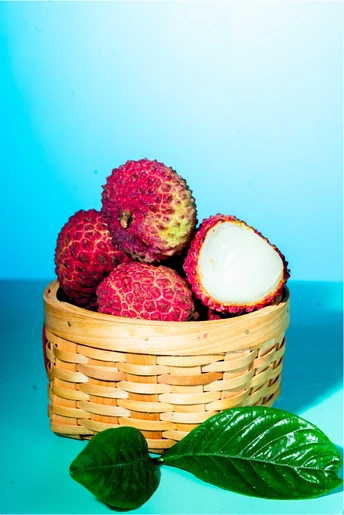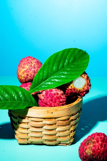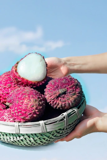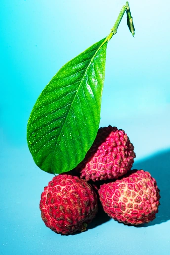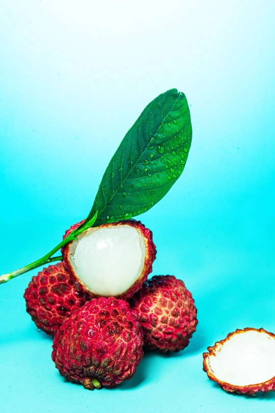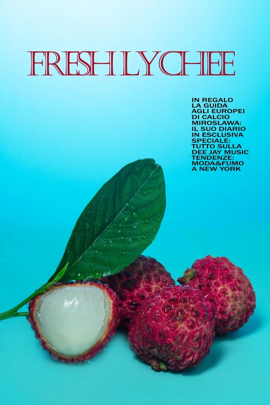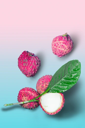 抓住荔枝粉红、背景蓝粉渐变,展现果实鲜润质感。