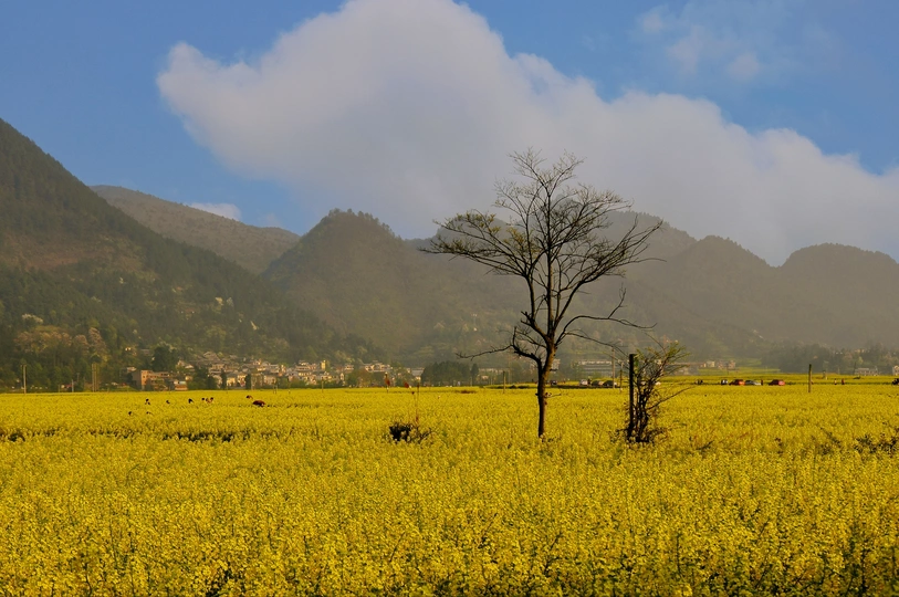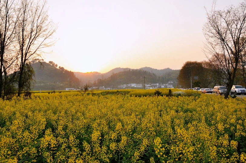 踏入这片油菜花田,像是误闯进梵高的调色盘。明黄花朵肆意铺展,远山如黛,孤树添了几分禅意,村落隐在山后,烟火与自然相融,风里都飘着温柔的香。 黄昏吻过油菜花田,染得天边一片暖橙。花浪随风轻摆,远山抱着落日,村落的白墙黛瓦,晕染出归乡的诗意,连沉默的树,都在这光影里,藏了一整个春天的故事。