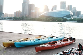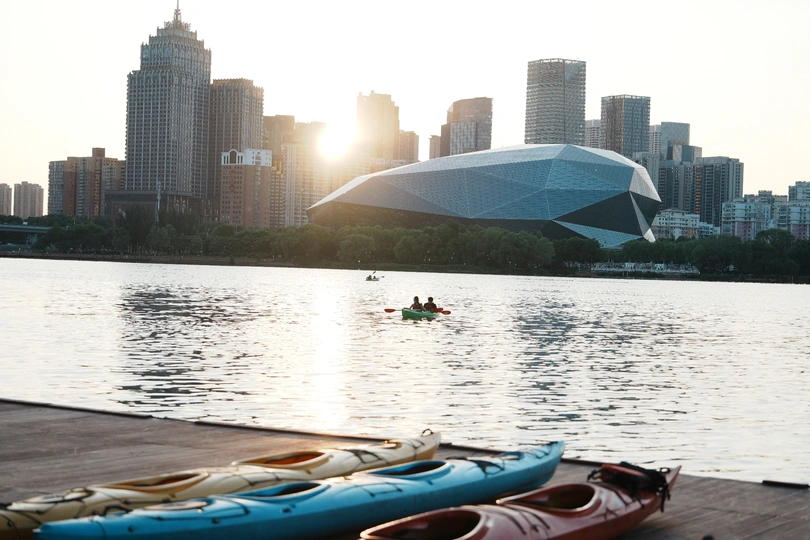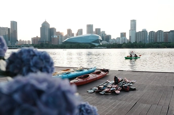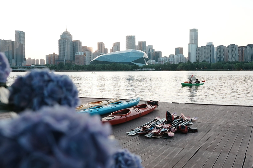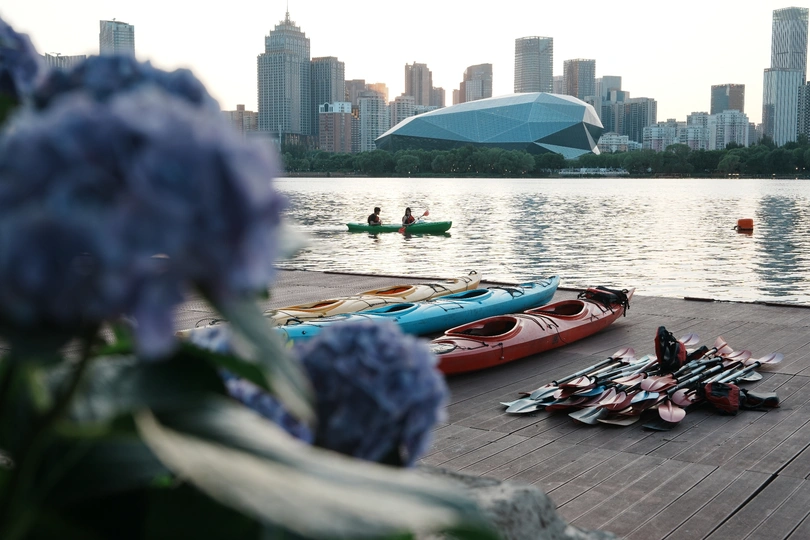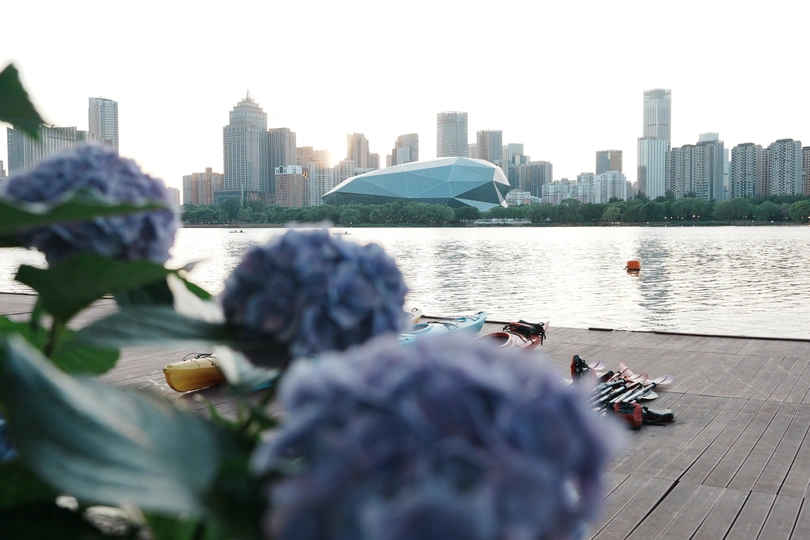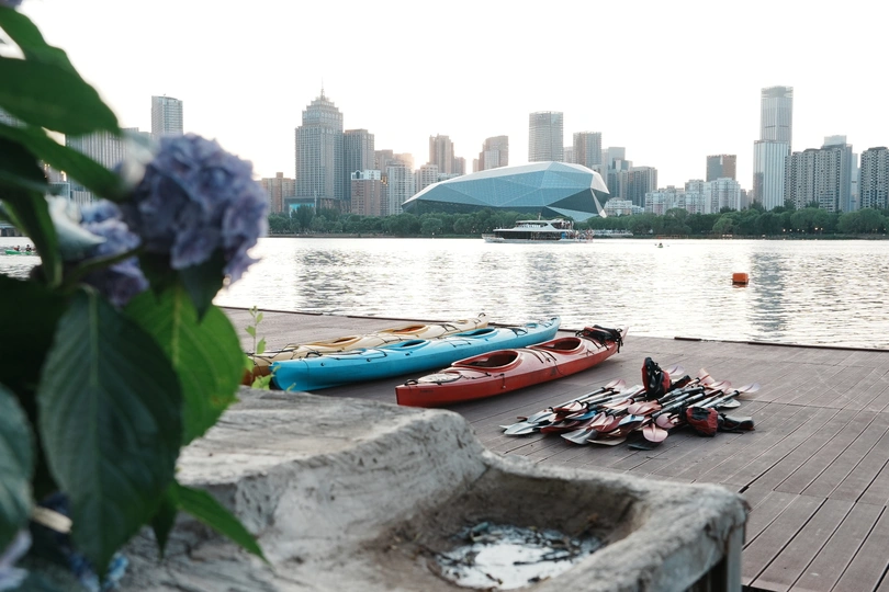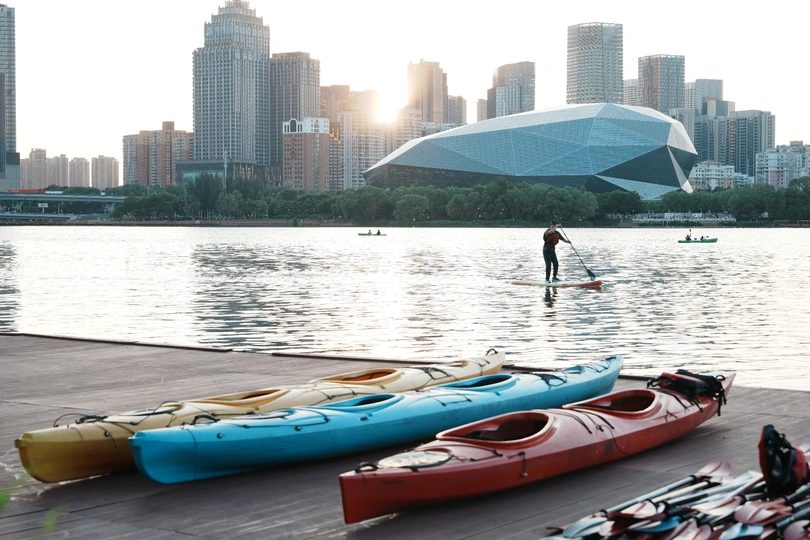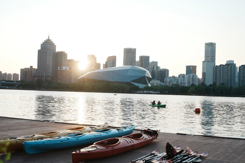 奥林匹克九号码头,有桨板项目,对面是沈阳著名盛京大剧院(俗称大钻石)