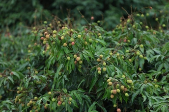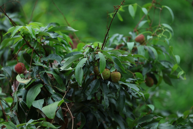 瞧,那片郁郁葱葱的荔枝树生机勃勃。翠绿的枝叶间,荔枝果实星星点点。有的还是青绿色,透着青涩;有的已泛出淡淡红晕,好似羞涩的少女。它们小巧玲珑,在微风中轻轻晃动,仿佛在俏皮地招手,散发着自然的清新与甜美气息。
