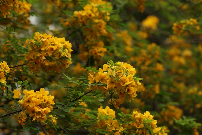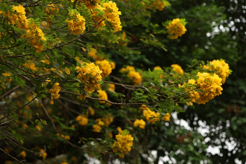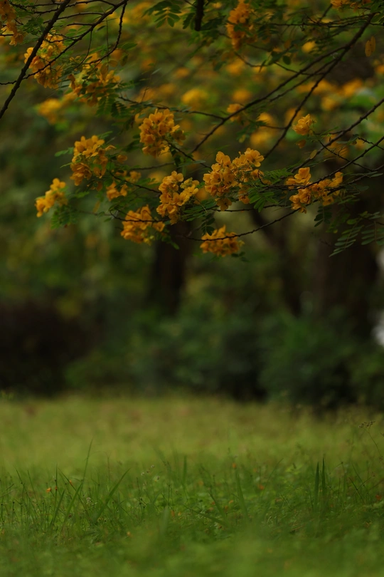 画面中,决明花于枝头肆意绽放。那明艳的黄色花朵如璀璨星辰,簇拥成一团团绚烂。枝叶在旁舒展,为花朵添了几分衬托。下方的草地绿意盎然,与金黄花朵相映成趣。整幅画面宛如自然精心绘制的油画,洋溢着生机与美好。