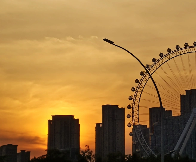 城市的黄昏总藏着浪漫,夕阳给建筑、摩天轮描上金边,路灯静静伫立,像在等一场与暮色的温柔对白,这一刻,喧嚣被染成暖黄,连时光都慢了下来 。