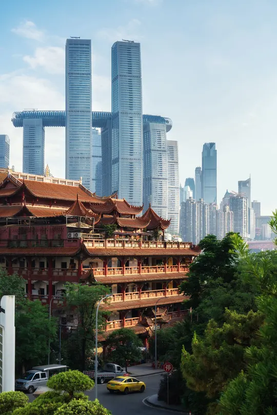 这张照片拍摄于重庆著名的“千佛寺 × 来福士”同框机位,是一处极具代表性的城市摄影打卡点。画面中,近处的千佛寺古建筑群飞檐翘角、朱墙金瓦,散发出浓厚的巴渝传统文化气息;远处则是现代感十足的重庆来福士大楼群,尤其是被称为“横向摩天楼”的“水晶连廊”,如太空母舰般凌空横卧,展现了城市飞速发展的未来感。 传统与现代在同一画面中交融碰撞,形成了强烈的视觉与文化对比,也完美诠释了“山城重庆”的历史底蕴与时代变迁。这里不仅是本地人喜爱的静心场所,也是摄影爱好者眼中的“时空交汇”之地,是了解重庆文化独特魅力的绝佳视角。