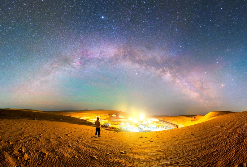 甘肃民勤摘星小镇上空的银河拱桥。
