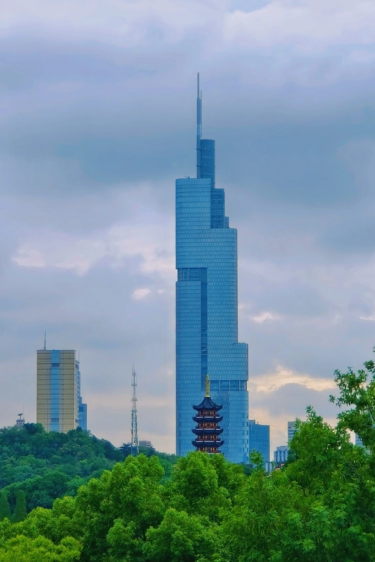 紫峰大厦与古鸡鸣寺同框。(vivo手机x90)