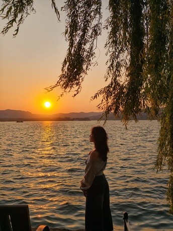落日沉溺于橘色的湖,晚风沦陷于赤诚的爱,我在西湖边,与温柔相逢,看夕阳把心事,说给山水听。