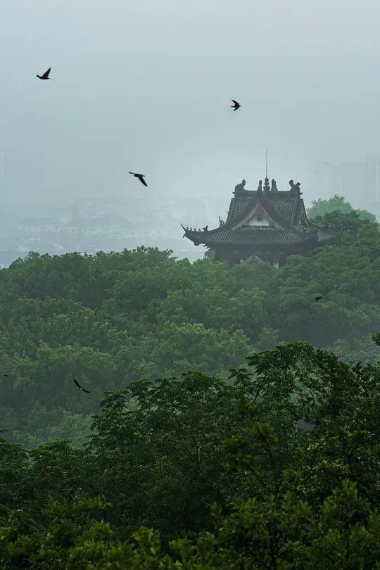 茂密翠绿的府山上,蓬莱阁隐现,飞檐翘角,古意盎然。天空被雾气笼罩,添了几分清幽静谧,几只飞鸟穿梭其中,让静态画面有了灵动生气,远处朦胧的建筑轮廓,模糊了自然与人文边界,营造出悠远、含蓄的意境 ,仿佛时间都在此刻慢下来,尽显东方美学的含蓄韵味。
