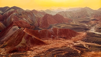 画面展现了张掖七彩丹霞一片壮丽的丹霞地貌景观。连绵起伏的山峦色彩丰富,红、黄、棕等色调相互交织,层次分明。山体形态各异,有的陡峭险峻,有的平缓绵延。山脚下是开阔的谷地,分布着一些稀疏的植被和蜿蜒的小路。远处的山脉在阳光的映照下,呈现出朦胧的美感,天空则是温暖的黄色调,整个画面给人以雄浑壮阔、大气磅礴之感。