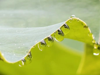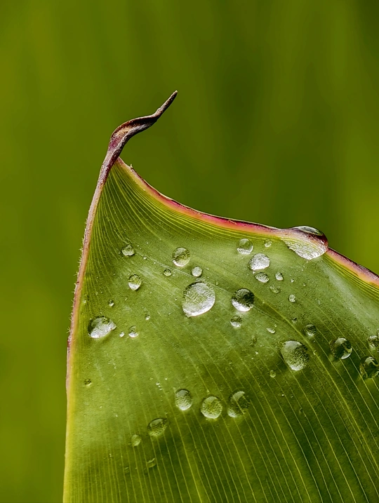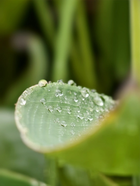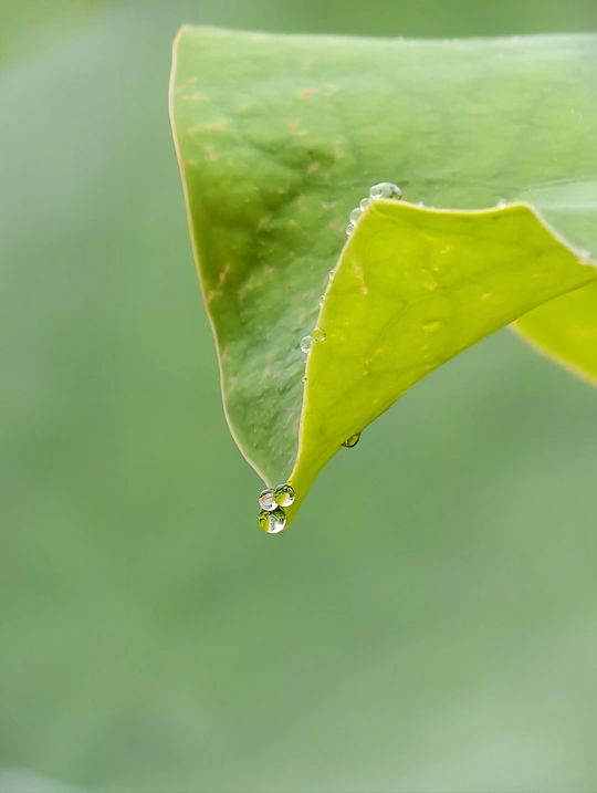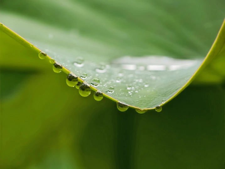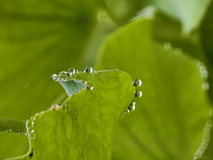 绿叶片片,雨珠点点,像大自然写下的省略号,省略了尘世纷扰,只留这清透与鲜亮。