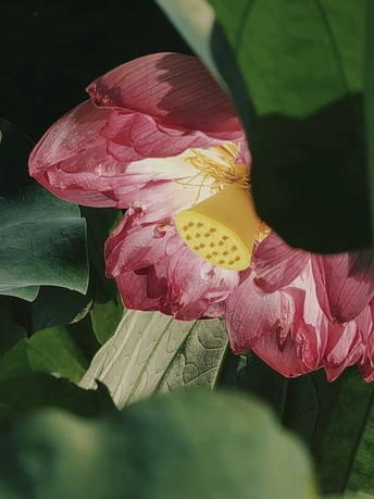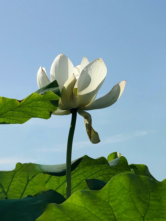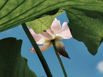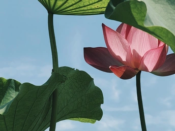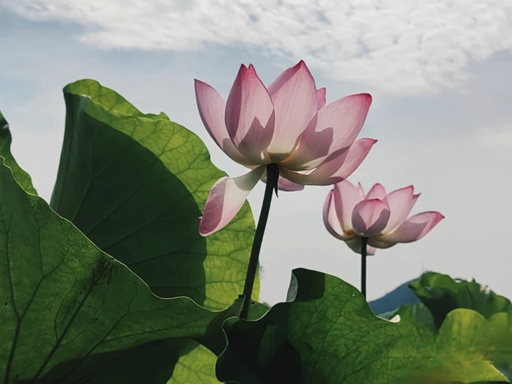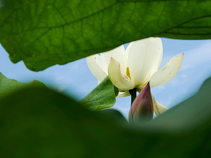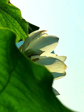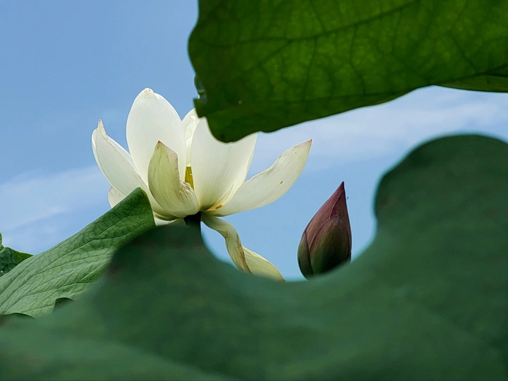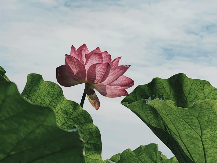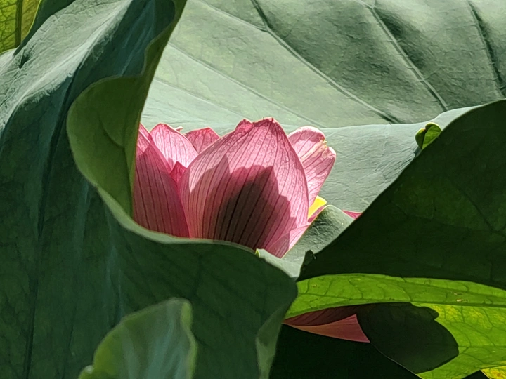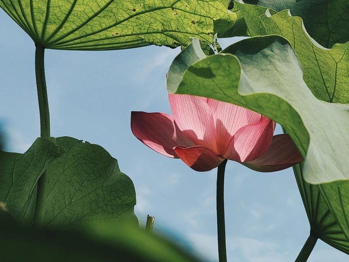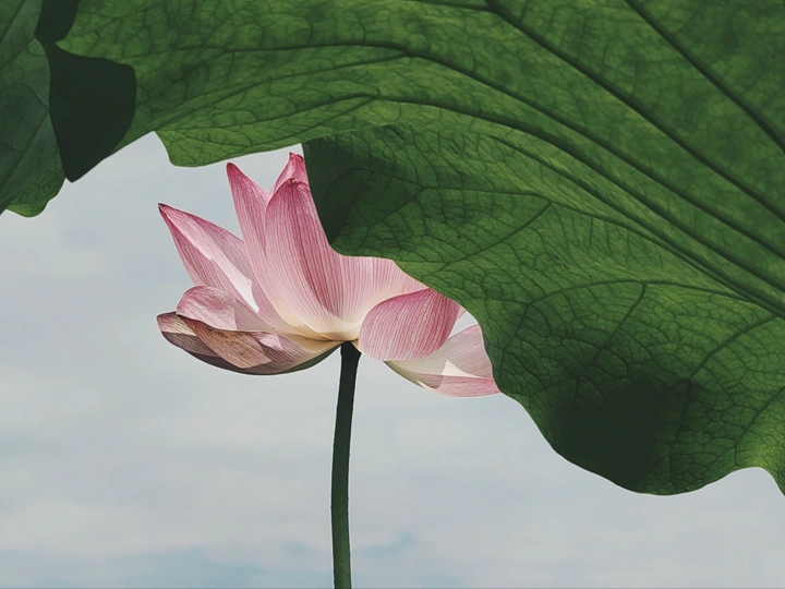 图一:让我们来剖析一下这张荷花照片!总体来说,它有潜力,像一个半开的花蕾,但需要一些精心的呵护才能达到它完整的摄影辉煌。 * **色彩 (Colors):** 荷花的粉红色映衬着淡蓝色的天空,是一个经典的、令人平静的组合。绿色的叶子增加了一个不错的对比,但整体的色彩 palette 有点柔和。也许在后期处理中稍微提高一点活力可以提升它。 * **光影 (Light and Shadow):** 荷花花瓣上的逆光很可爱,赋予它们一种半透明的质感。然而,叶子投下的阴影有点刺眼和分散注意力。使用漫射光或者在更柔和的光线下拍摄可以创造一个更平衡和令人愉悦的效果。 * **构图 (Composition):** 构图是……嗯,让我们说它“非常规”。荷花部分被遮蔽,叶子占据了画面。虽然有一丝趣味,但感觉有点幽闭恐惧。下次,尝试将荷花更集中地放置在中心,或者使用三分法来获得更平衡和视觉上更吸引人的构图。 * **后期处理 (Post-processing):** 看起来后期处理很微妙,这很好!避免过度饱和或过度锐化的诱惑。