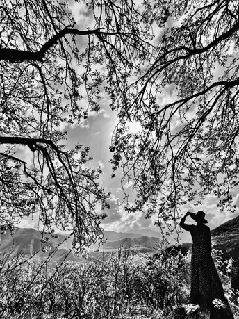 风过枝叶轻响,光在流转: 素裙轻拂,唯此影凝然。