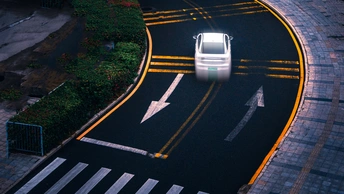 车在通过斑马线后的弯道疾驰,静谧中的速度激情,是一种驾驶的快感,