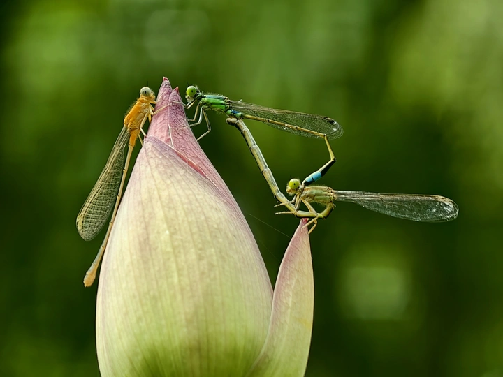 这是用Vivo200U自带微距拍的,手机自带微距很容易对焦,荷苞上的两只豆娘正在爱恋,感觉一只豆娘正在和苞后面偷窥。